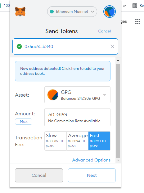 09. 메타마스크에서 Vaisen 지갑으로 GPG 토큰을 보내려면 GPG 토큰을 클릭하고 보내기 버튼을 클릭합니다. 여기에 보낼 GPG 금액을 입력하고 거래 수수료를 선택한 후 Next 버튼을 클릭합니다.