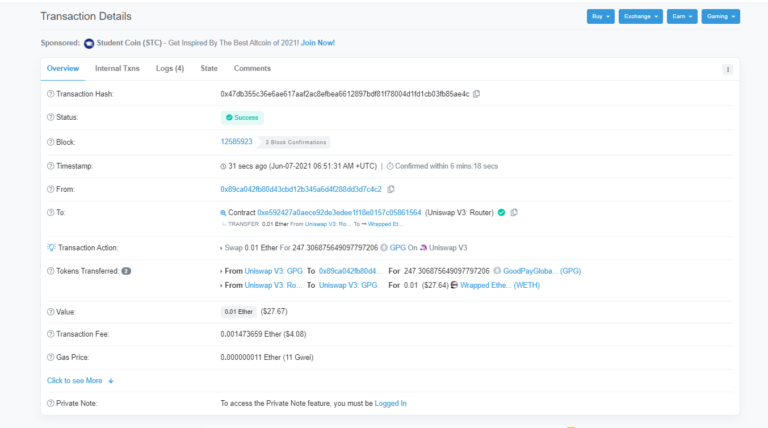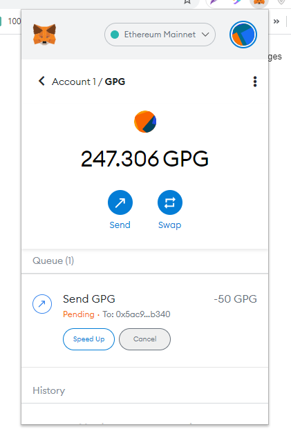 11. 거래가 성공하면 GPG 잔액이 업데이트됩니다.