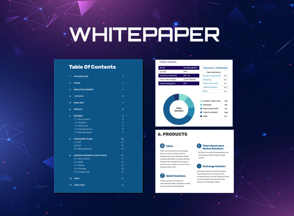 굿페이는 당신의 요구사항에 따라 적절한 연구와 기법으로 모든 블록체인 프로젝트에 대한 설계와 콘텐츠를 포함한 전문적인 비즈니스 백서를 만드는 서비스도 제공하고 있다.